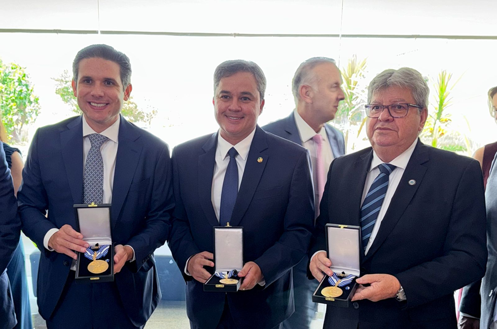 Em um almoço festivo realizado no restaurante oficial do Sesc na Câmara dos Deputados, nesta quarta-feira (09/04), o Sistema Fecomércio-PB prestou homenagem ao senador Efraim Filho (União Brasil-PB) com a entrega da Medalha Mérito Comercial Corálio Oliveira. A comenda reconhece os relevantes serviços prestados pelo parlamentar ao comércio paraibano e foi entregue pelas mãos do presidente da Fecomércio PB, Marconi Medeiros. A condecoração também foi concedida ao presidente da Câmara dos Deputados, Hugo Motta (RP-PB) e ao governador João Azevedo (PSB-PB).