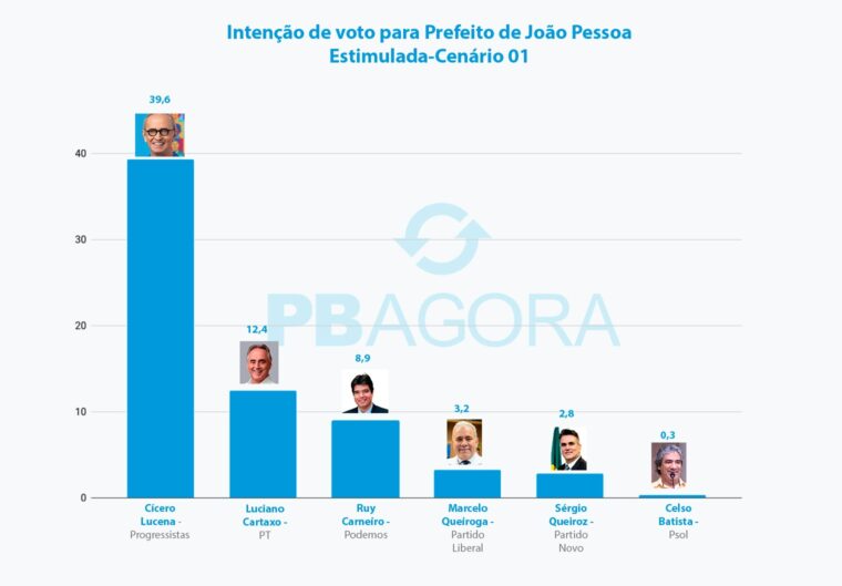 O prefeito de João Pessoa, Cícero Lucena (Progressistas) aparece liderando a disputa pela prefeitura de João Pessoa para as eleições desse ano com 39,6% das intenções de voto contra 12,4% de Luciano Cartaxo (PT), que aparece como segundo colocado, conforme dados levantados pela pesquisa do Instituto Datavox, em parceria com o portal PB Agora, divulgados nesta quinta-feira (07).