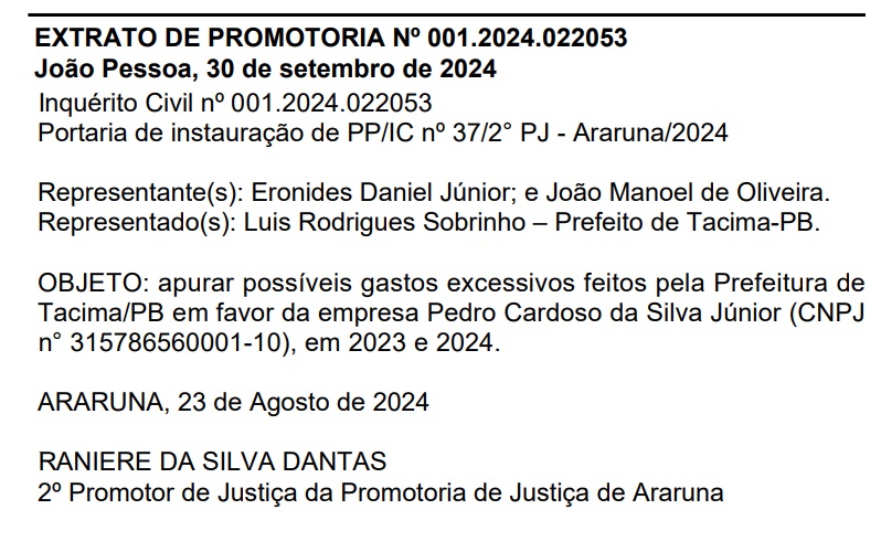 O Ministério Público da Paraíba (MPPB) abriu uma investigação para apurar supostos gastos excessivos entre à Prefeitura de Tacima e uma empresa. Inquérito Civil é coordenado pelo promotor de justiça, Raniere da Silva Dantas, da promotoria de Araruna. O extrato de abertura da investigação foi divulgado na edição do Diário Oficial da instituição, desta terça-feira (1º).