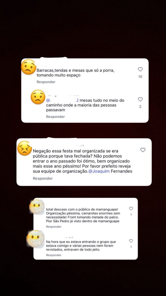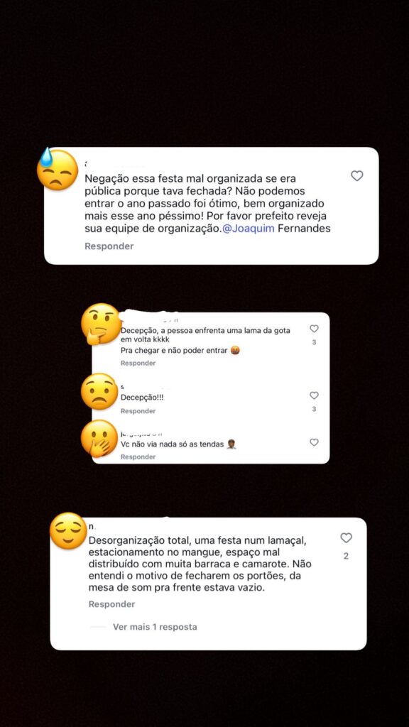 Outro ponto de destaque nas críticas foi a quantidade excessiva de barracas dentro do perímetro da festa, muitas com mesas e cadeiras ocupando áreas de circulação. Para muitos, isso comprometeu a mobilidade do público e a visibilidade do palco principal, gerando a sensação de que o espaço estava sendo mais utilizado para fins comerciais do que para o lazer da população.