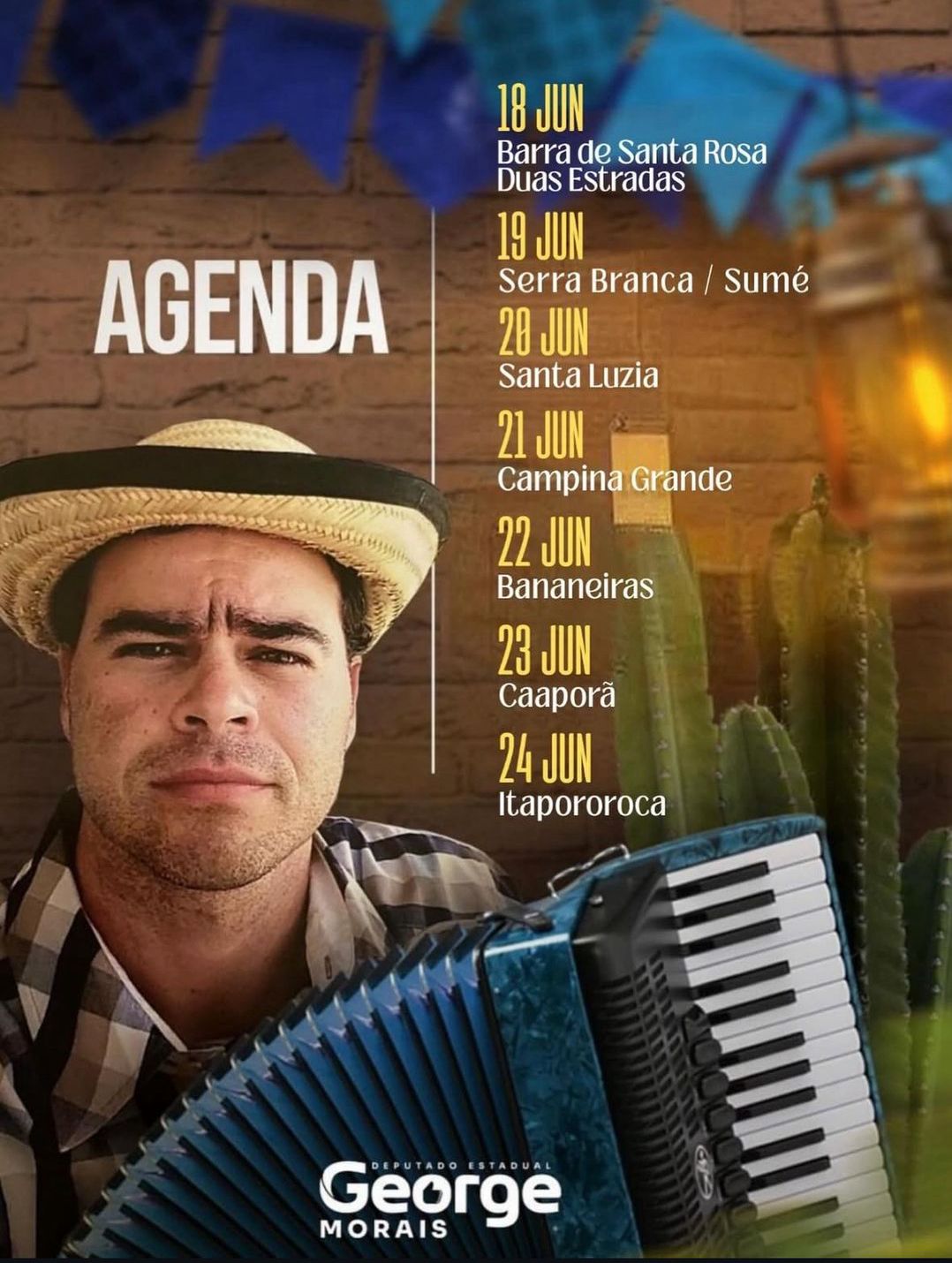 Do dia 20 ao dia 24, George Morais participará das comemorações de São João nos municípios de Santa Luzia, Campina Grande, Bananeiras, Caaporã e Itapororoca, última data da turnê do final de semana.