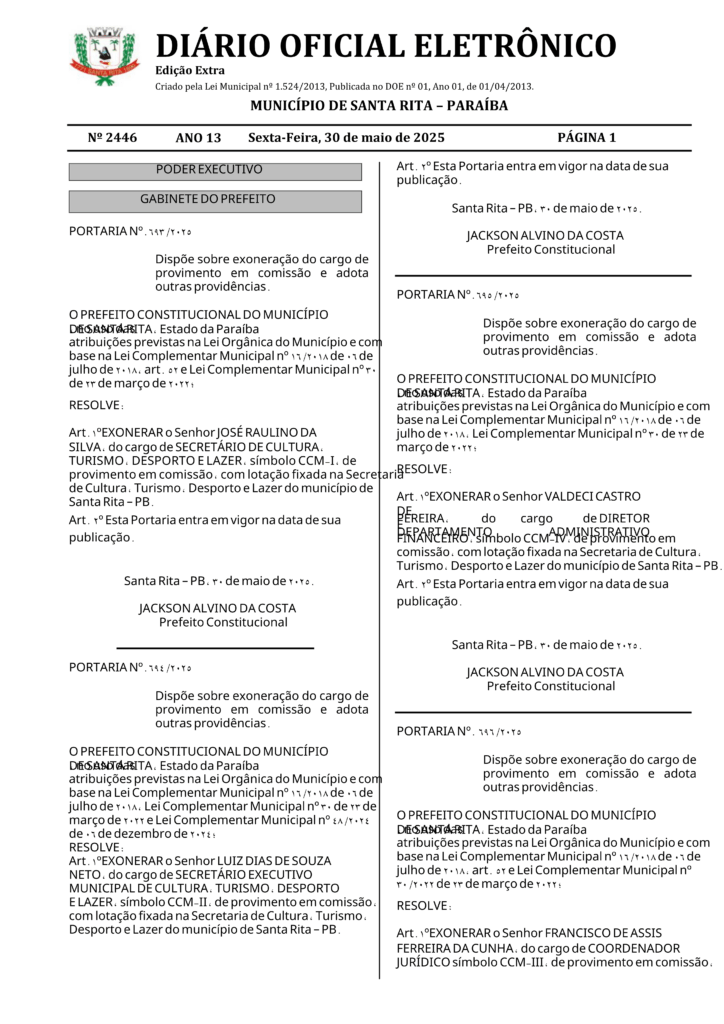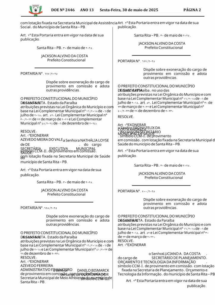 Oprefeito de Santa Rita, Jackson Alvino, exonerou todos os secretários e servidores comissionados ligados ao ex-prefeito Emerson Panta, em uma medida que confirma o rompimento político entre os dois, algo que já vinha sendo especulado nos bastidores da política local.