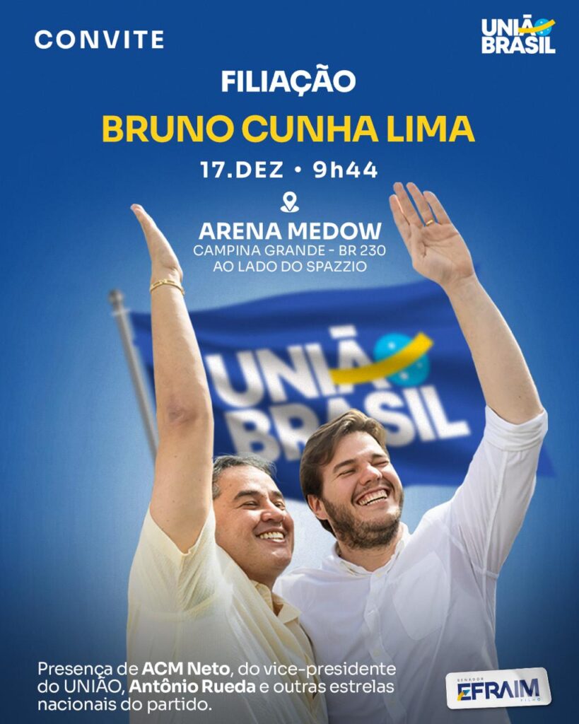A Presidência Estadual do Partido União Brasil na Paraíba emitiu convite oficial para a cerimônia especial de filiação do atual prefeito de Campina Grande, Bruno Cunha Lima que, após meses de negociações, deixará o PSD (Partido Social Democrático) da senadora Daniella Ribeiro e migrará para a legenda comandada estadualmente pelo senador Efraim Filho.