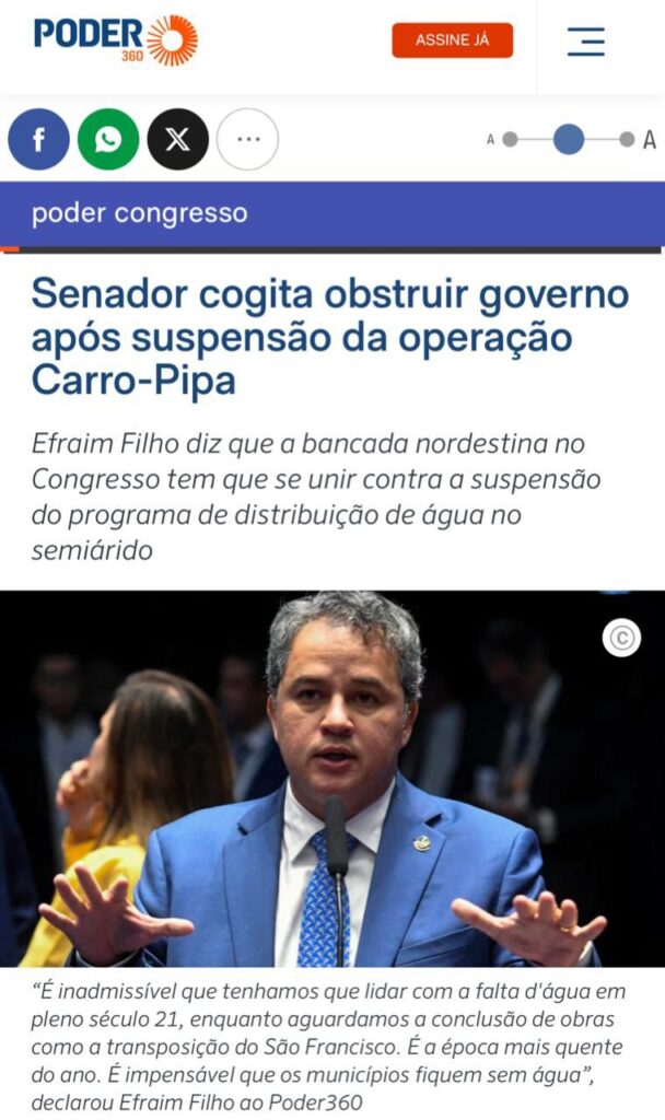 Após a suspensão, nesta segunda-feira (25/11), da Operação Carro-Pipa na Paraíba, interrompendo o programa que leva água potável para a região do semiárido brasileiro, a postura do senador do União Brasil, Efraim Filho (PB), diante do problema, tem sido destaque na imprensa nacional, a exemplo da manchete do portal Poder 360. Principalmente, porque o líder paraibano está mobilizando a bancada do Nordeste para obstruir votações de interesse do governo até que o abastecimento de água seja retomado.