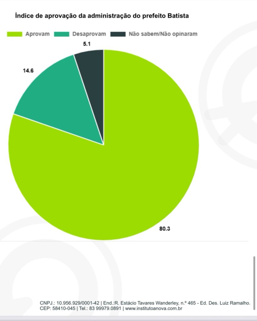 A aprovação ao prefeito Batista é consistente em praticamente todos os recortes analisados. Entre os mais jovens, de 16 a 24 anos, 83,3% avaliaram positivamente sua gestão. Já entre os eleitores de 45 a 59 anos, o índice foi de 84,7%. O apoio também é maior entre os entrevistados com ensino superior, onde a aprovação chega a 100%