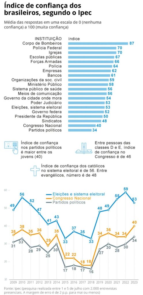 O índice do Ipec atribui notas de zero a cem para 20 instituições, sendo que zero indica nenhuma confiança e cem, muita. As entidades ligadas à política ainda são “lanternas” no ranking, mas nunca desde 2009 atingiram os atuais patamares. Partidos políticos chegaram a 34 pontos nessa escala e estão na última posição, mas com um aumento de quatro pontos em relação a 2022. Já o Congresso marcou 40, alta de seis pontos em um ano. Entre 2015 e 2018, por exemplo, os partidos marcavam entre 16 e 18, enquanto o Congresso registrou entre 18 e 22.