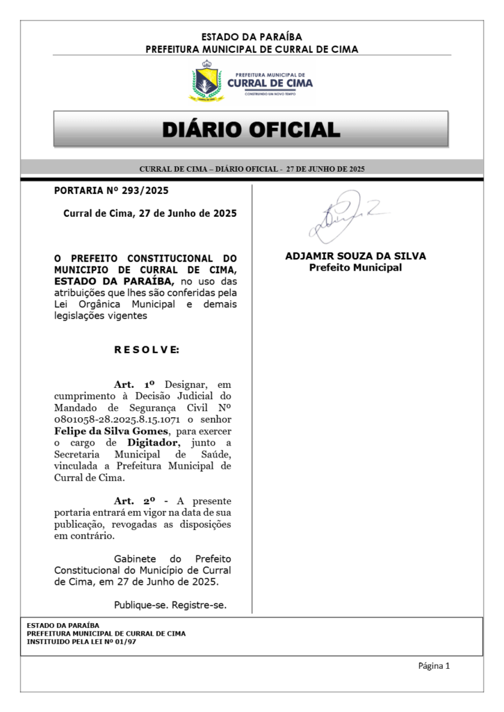 O Diário Oficial do Município de Curral de Cima, na edição do dia 27 de junho de 2025, trouxe a publicação das nomeações de servidores concursados, atendendo a uma determinação da Justiça. A medida ocorre em cumprimento à ordem judicial expedida no processo de número 0800787-19.2025.8.15.1071.