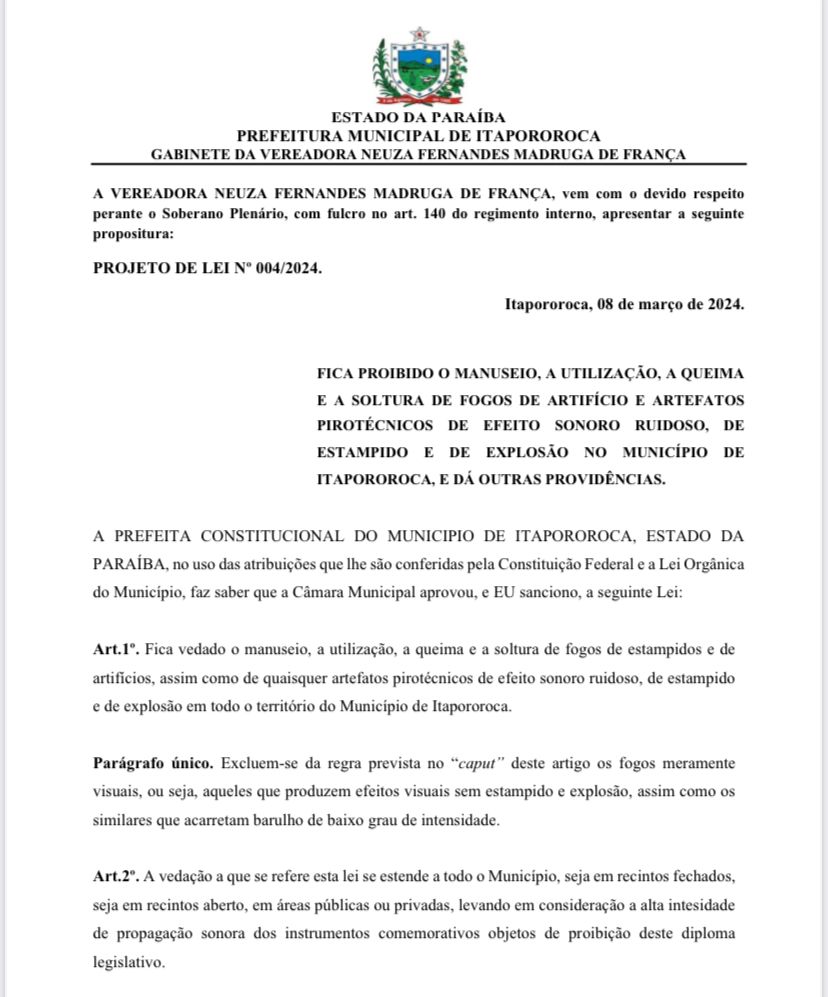 Na noite de ontem (12), a presidente da Câmara Municipal de Itapororoca, Neuza Madruga, usou a tribuna para apresentar seu Projeto de Lei N° 004/2024, que diz o seguinte: FICA PROIBIDO O MANUSEIO, A UTILIZAÇÃO, A QUEIMA E A SOLTURA DE FOGOS DE ARTIFÍCIO E ARTEFATOS PIROTÉCNICOS DE EFEITO SONORO RUIDOSO, DE ESTAMPIDO E DE EXPLOSÃO NO MUNICÍPIO DE ITAPOROROCA, E DÁ OUTRAS PROVIDÊNCIAS.